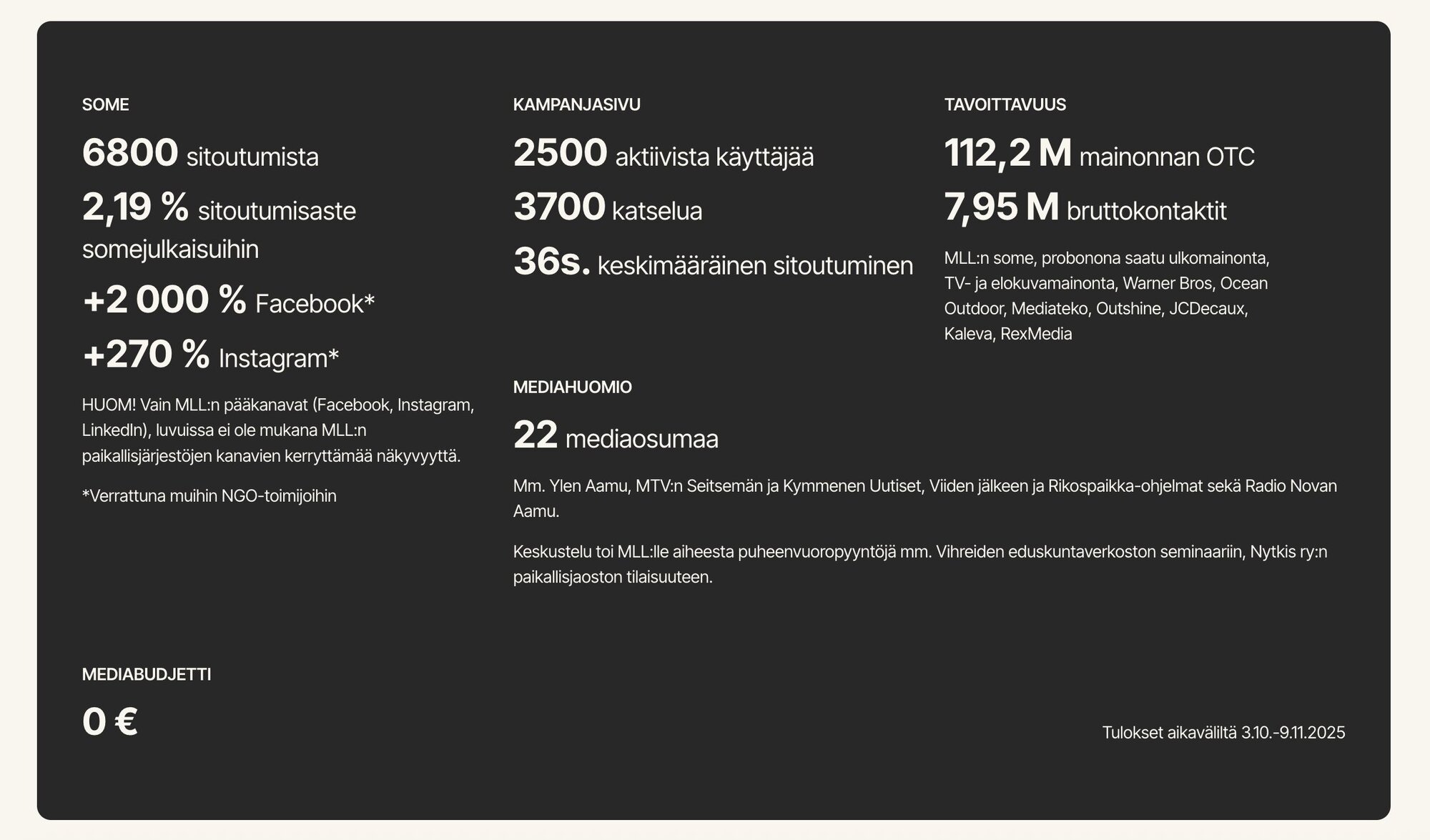 Kampanjan myötä MLL sai kutsuja eri toimijoiden, kuten Vihreiden ja Nytkis ry:n, tilaisuuksiin keskustelemaan aiheesta.