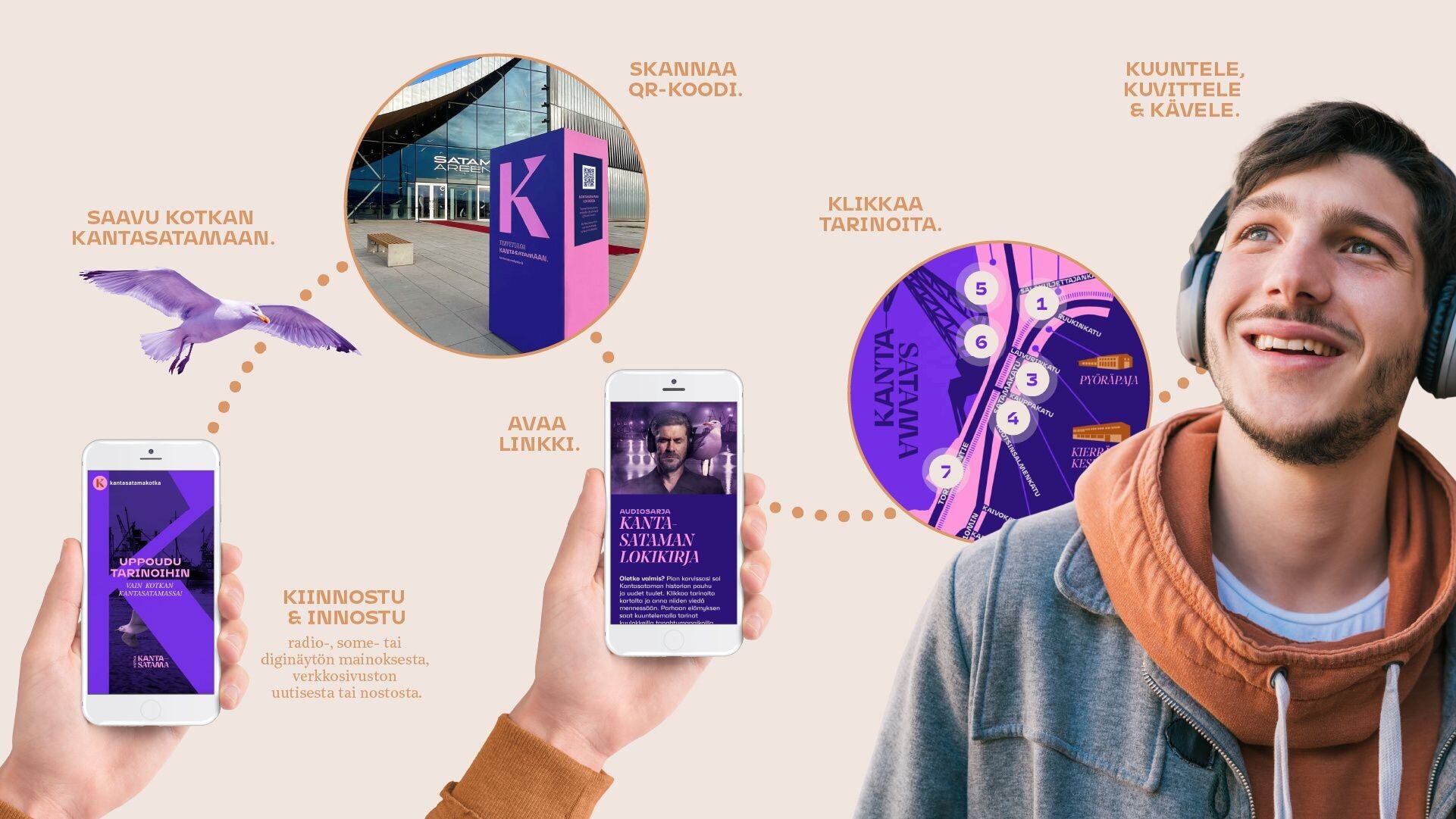 Kesällä 2023 saimme Kantasatamalta toimeksiannon, jossa toiveena oli toteuttaa alueelle brändin mukainen kampanja. Suurin osa Kantasatamaan sijoittuvista toiminnoista oli kuitenkin tuolloin vielä rakennusvaiheessa, eli palveluihin perustuvia houkuttimia ei juuri ollut käytössä. Uusi brändi ei myöskään näkynyt alueella. Syy viipyilevään vierailuun Kantasatamassa piti siis löytää jollakin muulla kuin konkreettisiin palveluihin keskittyvällä keinolla. Ajatuksena oli myös luoda jotain pitkäikäistä, jota voisi jatkossakin hyödyntää Kantasataman markkinoinnissa.